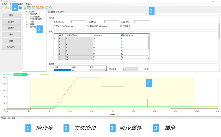 方法编辑模块允许您创建或修改方法以满足您不同的实验要求。它包含用于控制运行的所有指令。方法编辑模块包含专为层析运行提供的内置应用支持。通过该界面,可以轻松查看和编辑运行参数。图 6 显示了方法编辑模块的截屏,带有可定制的窗格,提供了运行的全面总览。通过方法编辑模块,可以为不同的层析技术和维护程序选择预定义方法。方法使用阶段进行构建,每个阶段反映了运行中的一个步骤,例如上样或清洗。PPSN 包括一个预定义阶段库,用于创建或编辑您自己的方法。通过将阶段从阶段库拖放到方法阶段来创建或编辑方法。